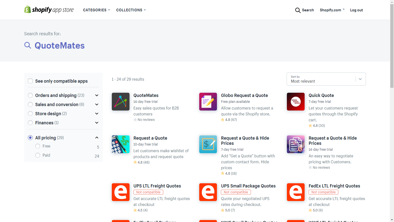 ● Log In to your Shopify Admin panel and go to “ Apps ” and then visit the Shopify App Store and Search for “ QuoteMates ”.