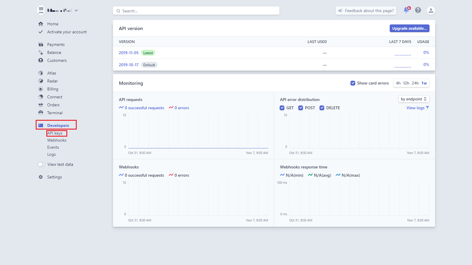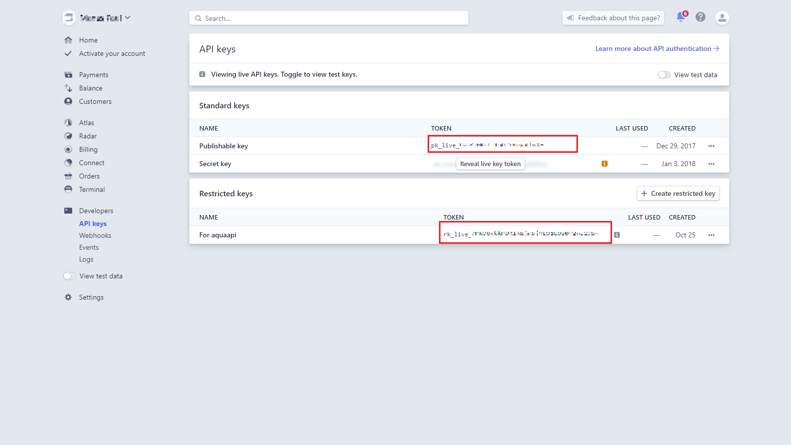 1. Login to your Stripe Dashboard and go to "Developers -> API Keys" from the left side menu.