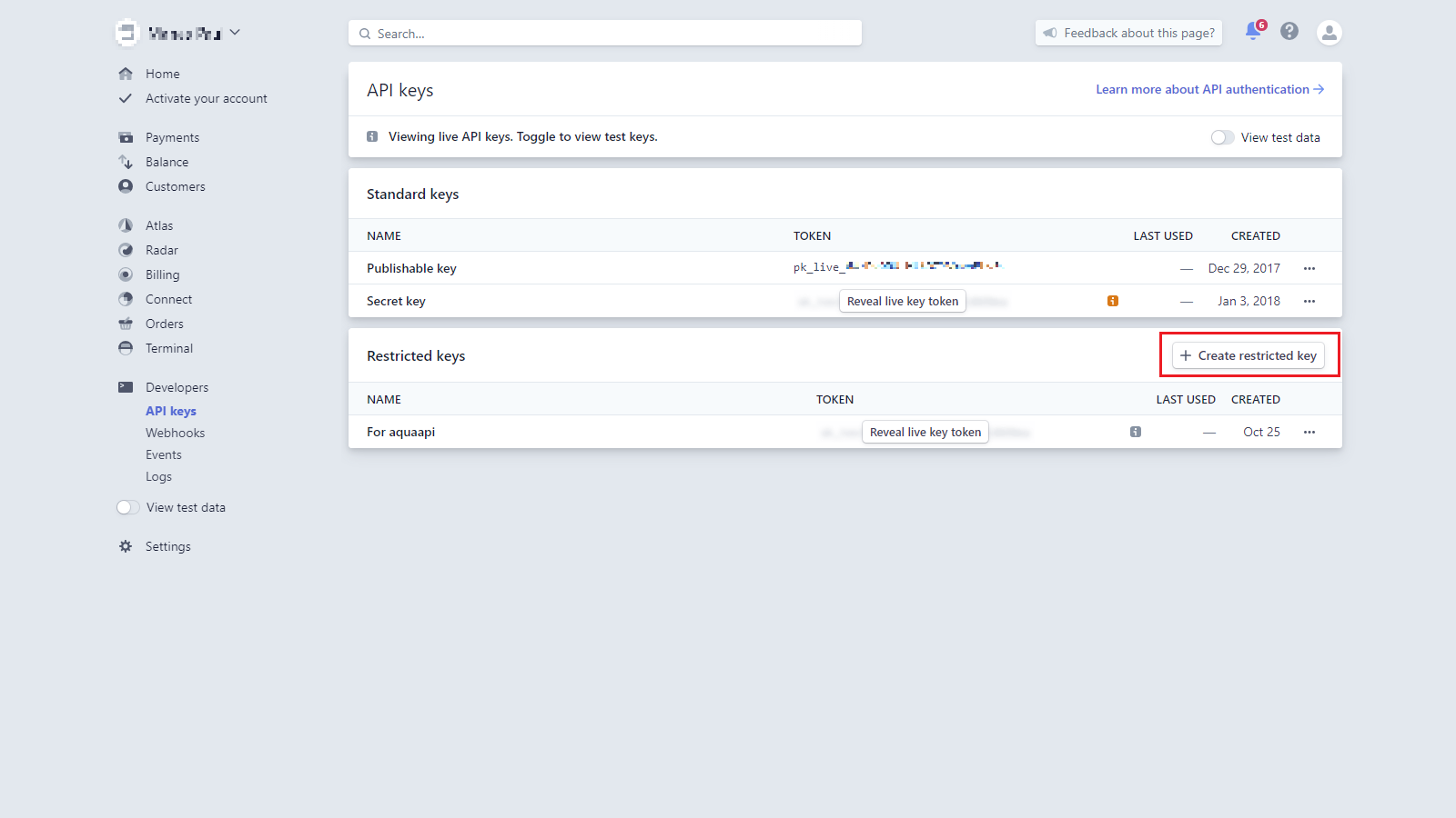 2. The publishable key will be available there but you have to create Restricted key. Click on Create Restricted Key button.